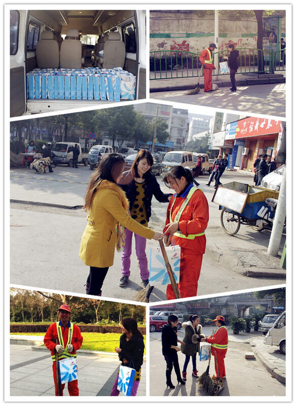清晨東方未見光,寒氣襲人透身涼。千家萬戶尚熟睡,環(huán)衛(wèi)工人已上崗。手握笤帚掃垃圾,推著車子串街巷。我們沿著北苑路、望道路、丹溪路、雪峰路、市民廣場等沿城區(qū)主要街道,一路下來尋找環(huán)衛(wèi)工人的身影。賽爾集團(tuán)的志愿者們考慮到環(huán)衛(wèi)工人的工作性質(zhì),特地為他們準(zhǔn)備了保溫杯、熱水袋、棉襪、板藍(lán)根等。當(dāng)志愿者們把一份份“愛心”送到他們手里時(shí),他們的激動(dòng)之情溢于言表,紛紛對賽爾集團(tuán)的志愿者們表示感謝。