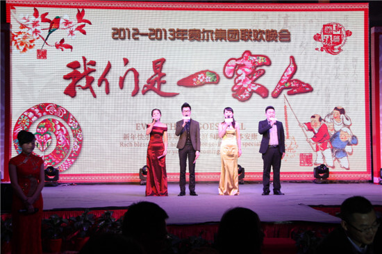 2月23日晚18:30,集團(tuán)2012-2013年度“我們是一家人”主題大型聯(lián)歡晚會(huì)在高貴典雅的T臺(tái)Fashion秀中拉開(kāi)序幕。集團(tuán)全體董事及600多名員工參加晚會(huì)。晚會(huì)由晚宴、節(jié)目表演、幸運(yùn)抽獎(jiǎng)、節(jié)目評(píng)比等環(huán)節(jié)組成。晚會(huì)主持人由集團(tuán)行政人事部胡靜靜、賽爾國(guó)貿(mào)吳錫東、優(yōu)景進(jìn)出口付潔、優(yōu)勝?lài)?guó)貿(mào)王淑樂(lè)四人擔(dān)任。