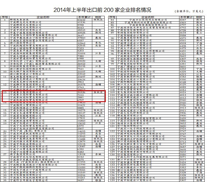 賽爾網訊 近日,市外經貿局公布了2014年1-6月份我市外貿進出口領域前200名企業榜單。我集團位列出口企業排行榜第13位,較去同期相比,排名提升12位;位列進出口企業排行榜第26位,較去同期相比,排名提升22位。