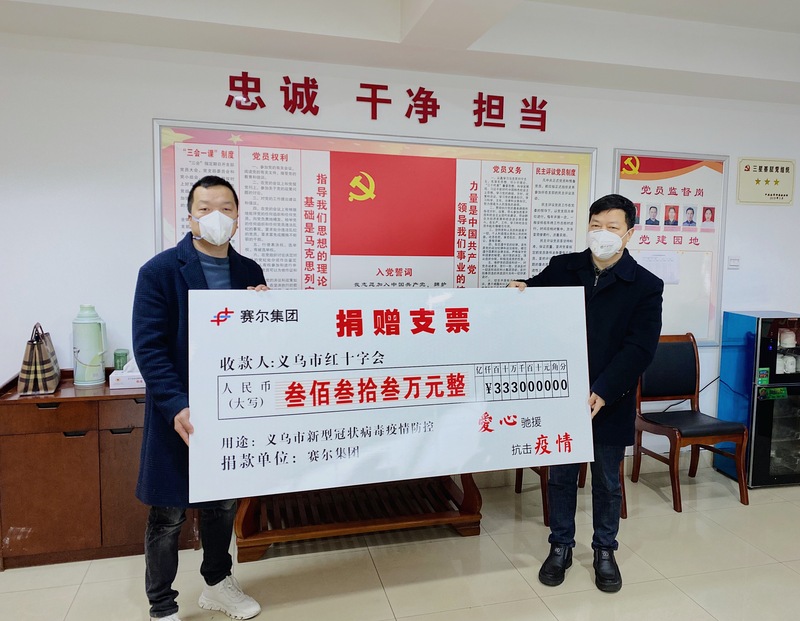 2月3日,賽爾集團(tuán)派代表分赴寧波市、義烏市兩地政府指定的接受捐贈(zèng)主體單位——寧波市慈善總會(huì)和義烏市紅十字會(huì),將666萬元善款(兩地各333萬元)一次性捐贈(zèng)到位,全力支持抗擊新冠病毒肺炎疫情。