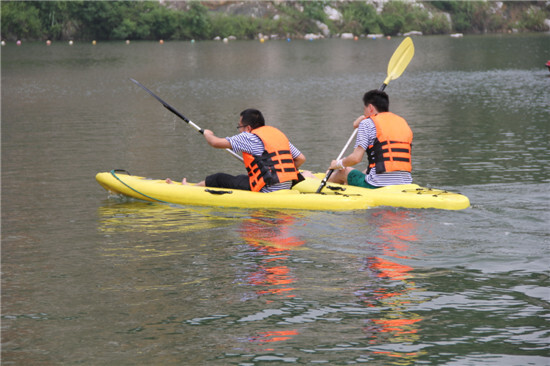 在水面上悠閑地劃著皮劃艇,怡然自得