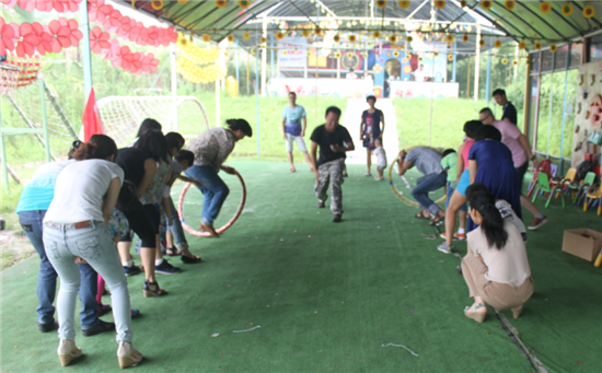 9:20分我們到達(dá)開(kāi)心谷活動(dòng)場(chǎng)地,在游戲教練的帶領(lǐng)下合影后開(kāi)始活動(dòng)熱身,抱團(tuán)游戲,孩子和家長(zhǎng)在一片歡聲笑中很快進(jìn)入游戲狀態(tài)。我們正式開(kāi)始第一個(gè)互動(dòng)游戲:破冰起航,家長(zhǎng)們報(bào)數(shù),重建團(tuán)隊(duì),通過(guò)思想動(dòng)員,孩子們報(bào)隊(duì)名、口號(hào),唱隊(duì)歌;隊(duì)歌不夠響亮的團(tuán)隊(duì)將接受懲罰。第一回合藍(lán)隊(duì)由于人數(shù)少隊(duì)歌嘹亮而旗開(kāi)得勝。紅隊(duì)雖受懲罰,但沒(méi)有氣餒,后面的游戲再接再厲,爭(zhēng)取贏得勝利。