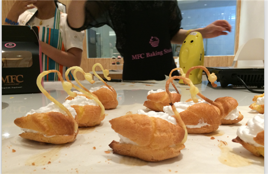 5月24日早上10:30,優(yōu)景童鞋們一行12人,相約在和義大道MFC烘培教室,學習“巧克力果仁司糠”和“天鵝泡芙”的制作。低粉拌蛋、擠天鵝脖子、烤造型、加奶油,天鵝泡芙誕生啦!