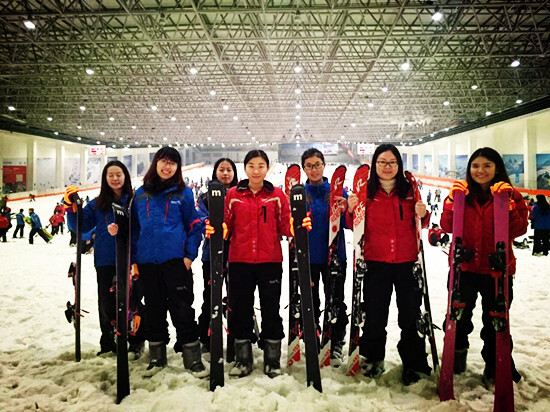 在咸亨酒店吃了午飯,對于吃我就不多贅述,總之味道好,分量少。午飯后就急匆匆地奔往下一站,此行最為期待的滑雪。也許是因為第一次體驗滑雪,大家都興致勃勃。到了喬波冰雪世界,我們一下車就迫不及待地沖進了售票廳,急切地想要去一探究竟,可是接下來真是漫長而又痛苦的一小時,排隊領衣服、換衣服、領鞋子、領滑板,人多擁擠,隊伍冗長。終于全副武裝進入滑雪場,聽完教練的大致講解,大家便躍躍欲試了,可想而知,那真是要摔多慘有多慘呀。整個雪場隨處可見摔跤、碰撞的場景,但是氣氛卻是異常的歡樂,在這里人與人之間沒有了陌生感,連摔跤都是幸福的。就這樣,在不斷摔倒又爬起來的過程中我們度過了愉快的下午時光。