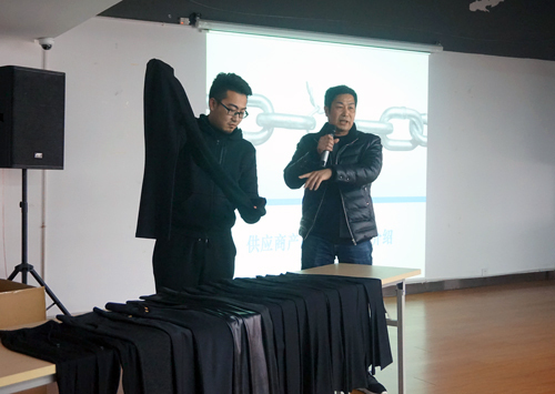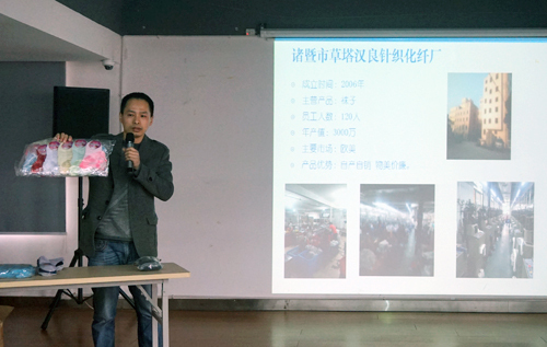 當(dāng)天,專業(yè)生產(chǎn)打底褲的浦江康之秀服飾公司總經(jīng)理張文杰恰巧前來拜訪,他認(rèn)為推介會(huì)形式很好,立馬拿了樣品和名片要求參加。在會(huì)上,他詳細(xì)介紹了工廠情況和打底褲材質(zhì)、款式、生產(chǎn)工藝流程及市場定位,真誠尋求更多合作。