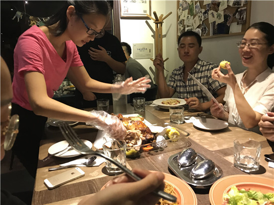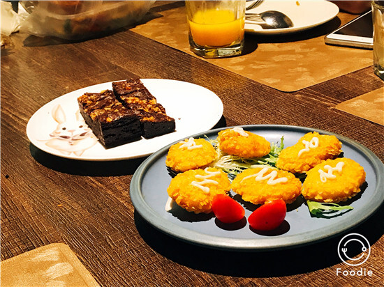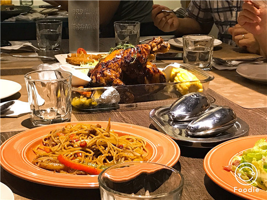 這次聚餐我們選在了義烏田畈西式簡餐,感受了網紅美食的魅力。提前預定的田畈秘汁烤全雞果然沒讓我們一行人失望,肉質鮮嫩,手撕過癮,多吃不膩,但貌似廚師大神今天用力過猛抖了太多鹽,不過口感還是極佳的。黑椒牛柳意面、芝士蓋飯、香酥鱈魚、焗大蝦、凱撒沙拉、鮮嫩牛排還有美味的披薩都很驚艷。好在這次留了胃給飯后甜點堅果布朗尼,濃郁的巧克力加上脆口的堅果,層次分明口感特別棒,飯后嘗一塊真是享受。