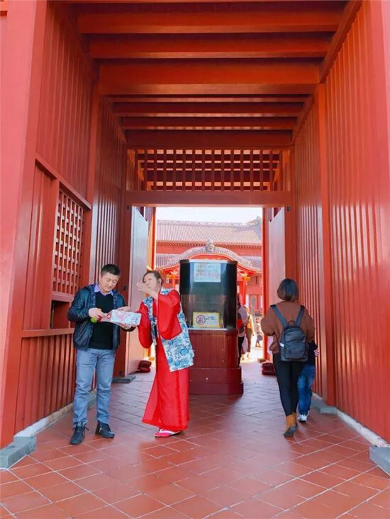 這日起得最早,8點已在酒店大廳集合,8點半就已經坐上前往首里城的有軌電車。首里城不遠,幾站就到。下車走過一條幽靜的小道,且行且攝,不消多時,便能遠遠的看到小山丘上的巍峨建筑。朱門金漆,現存的首里城一派唐朝風格。古琉球國最繁盛的時期又與向中國明清兩代朝貢密不可分。故而,整個首里城中處處可見中國元素,明清文化。你最大的體驗大概便是脫了鞋子,在日本的展覽環境中看了一圈大中華的文化,哈哈~