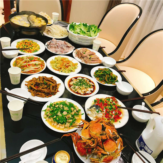 慵懶的午后,姑娘們在別墅內的卡拉OK館盡情展示歌喉,隨行的三個小朋友俏皮地在一旁玩起了躲貓貓,廚房內賢惠的人兒們說說笑笑的在為晚上的大餐做準備工作,誠摯的笑容縈繞在每個人的笑臉上。美好的時光總是讓人在不經意間度過,不一會兒就到了本次活動最重要的環節,那就是解決民生大計!鴻運當頭,吉祥三寶,瑪瑙翡翠,海上絲綢之路,五星紅旗,六月黃,春之歌。。。。。。伴隨著一個個美好的寓意,一道道精致的色味俱佳的菜肴,在燈光下泛出點點油光,撲鼻的香味陣陣襲來,不禁令人食指大動,忍不住大快朵頤。要問餐桌禮儀,菇涼們早已迫不及待地下箸,而晚宴后超長時間的消食時刻更是對光盤行動的完美續集。