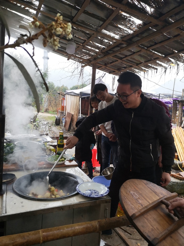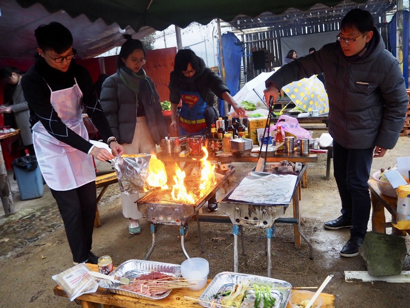 還未達到目的地,大家就迅速成立了“廚房真功夫組”、“BBQ組”、“手工餃子組”、“水果組”,摩拳擦掌,躍躍欲試,準備在戰場上開辟新天地。由張旭東、盧堂翠帶領的“廚房真功夫組”全都是廚藝了得的大廚,做出了姜汁皮蛋、白切雞、清蒸鱸魚、土豆燉牛肉等一道道色香味俱全的美味佳肴。每出一道菜,大家都蜂擁而上,一掃而光。由劉珊帶領的“BBQ組”都是燒烤達人,只要高喊一聲“烤好了”,覓食的人群們就會聞聲而來;“手工餃子組”出鍋后的香味讓人垂涎欲滴;“水果組”的手藝無比驚艷,有千禧果制作的兔子,有哈密瓜自成一體的水果拼盤。還有花費了近三個小時的烤全羊作為壓軸隆重登場,在即將出爐的那一刻烤全羊周圍圍滿了人群,共同等待品嘗美食。
