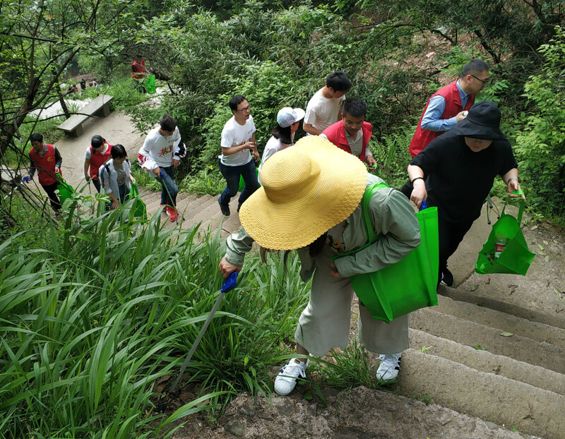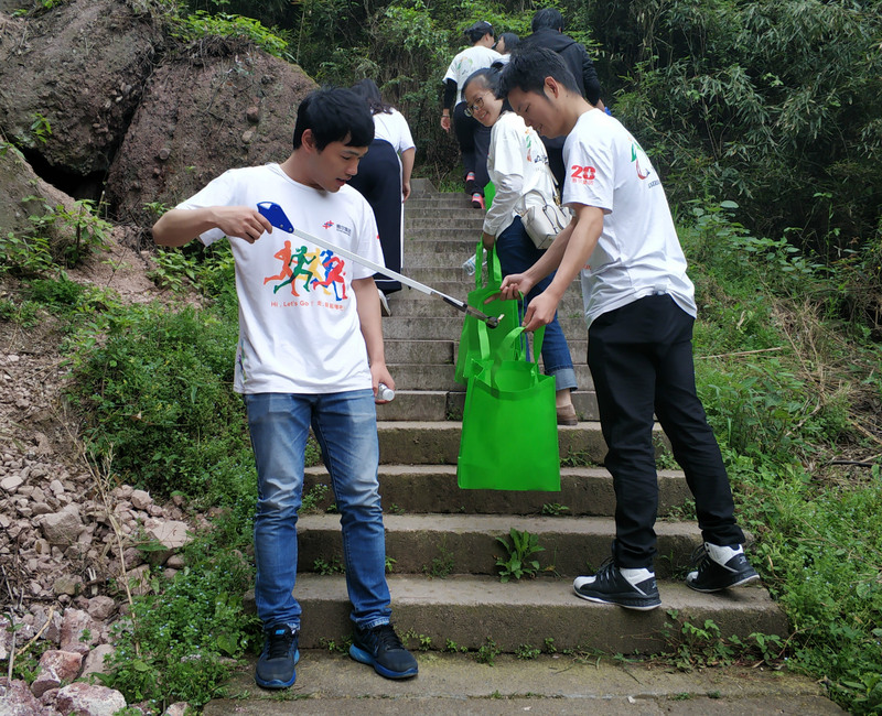 由于是山路,許多垃圾被扔在步道邊上的山谷中,撿拾難度比較大。為了撿這些垃圾,大家也是拼盡全力。女孩子們主動爬到陡峭的山谷中小心撿拾,不把這些垃圾“收入囊中”不罷休。