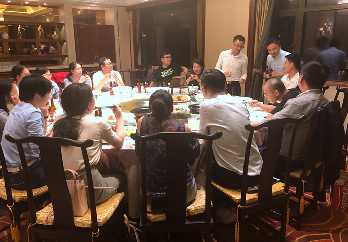 錢總因甚是思念大家,早早地就通知大家晚上要暢聊歡聚一堂。16日下班后我們?nèi)齼蓛梢惠v車陸續(xù)抵達,全員到齊后,大家舉杯共同慶祝這相聚的時刻。