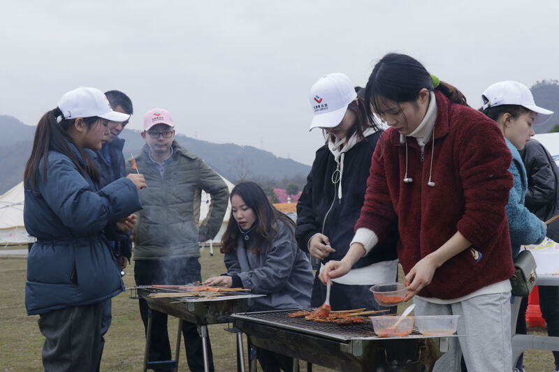 在山頂稍作休息后,我們轉戰了下一站目的地——花間樂園。五彩繽紛的風車被有序的排滿在山坡上,風一吹風車也就隨風擺動,頗有創意。我們租了帳篷和燒烤架,開始忙乎起來了。有的忙著燒烤,有的忙著包餃子,而一些人早已組局開始在帳篷里玩起游戲,或是圍坐著一起閑聊,舉杯暢飲。吃飽喝足以后,天氣也開始漸漸暗下來了,此次活動隨著黑夜的降臨落下帷幕。