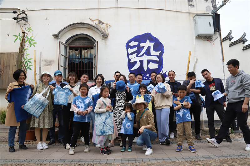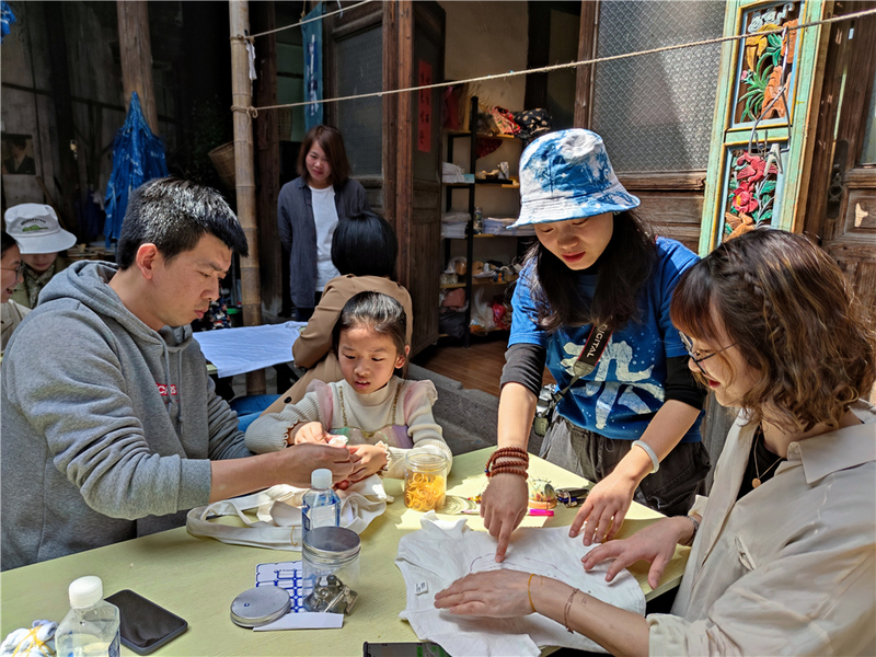 輕輕推開老底子的木頭門,映入眼簾的是一個靜謐純粹又極富藝術氣息的藍色世界,店里的每一件作品都是店主一針一線縫制、扎(蠟)染而成。在這里手作,是一種安靜的享受。專業工藝老師在講解藍染的歷史起源時,引起了大伙兒濃烈的求知興趣。選好物料后,我們跟隨老師,一步一步地捆扎、縫制、描稿、畫蠟、染布、脫蠟、漂洗,完成了一件件“藝術孤品”。