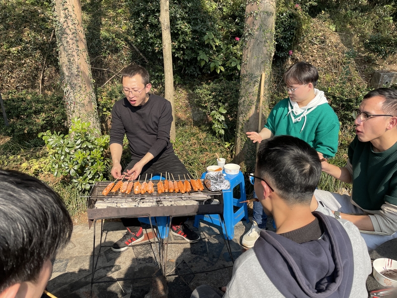 比賽結束后,大家在湖邊落座,冬日暖陽下,大伙兒互相分享零食、制作美味燒烤。新老同事打成一片,侃侃而談,甚是融洽。吃飽喝足后,策劃組還特別準備了諸多有趣的團隊小游戲,比如,跳大繩、群龍取水、蒙眼互打、你比劃我猜......各種互動小游戲讓大家重拾童趣,施壓解乏,小組成員間的配合也十分默契。不知不覺中已夕陽西下,我們肆意盡興,一天的團建輕松愉悅,所有人都還意猶未盡。