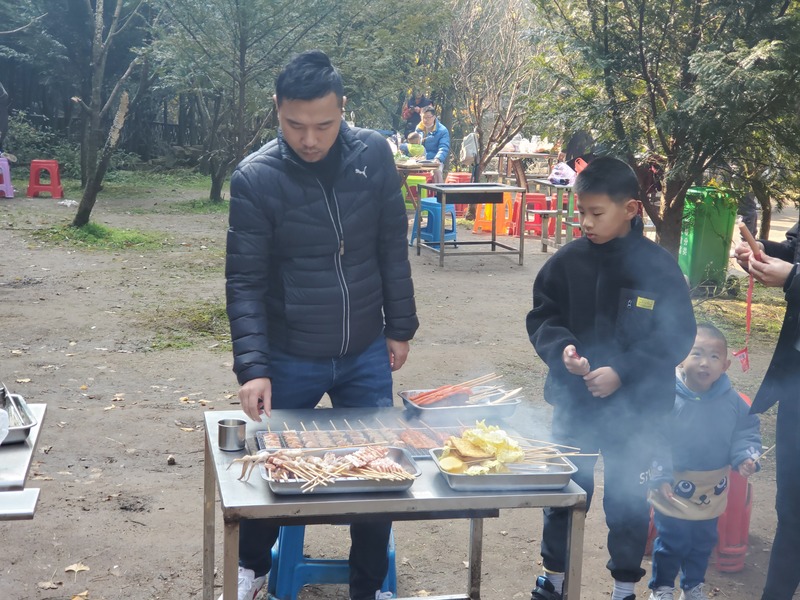 早上九點(diǎn)半,大伙兒整裝出發(fā),沿途經(jīng)過山路,蜿蜒曲折,能充分感受到大自然的氣息。行車一小時(shí),我們順利抵達(dá)目的地—“云上的日子”。這里有竹橋,溪水,樹林,很安靜,偶爾還感覺能聽到鳥兒的鳴叫的聲音。等小伙伴們陸續(xù)到齊,大伙兒開始選擇食材,找到了一塊較為平坦的空地,支起燒烤攤,一個(gè)個(gè)燒烤鋪?zhàn)禹樌伴_張”。之后便是各種烤物,有烤魚、烤五花肉、烤蔬菜、烤橘子、烤香蕉等等。重頭戲要數(shù)需要提前預(yù)訂的烤雞和竹筒飯,烤雞外酥里嫩,混著孜然,椒鹽的味道,入口有幸福的感覺;竹筒飯混著豆子玉米和肉,口感糯糯的,還有一層鍋巴,讓人吃了便停不下來。大家全程歡聲笑語,吃得非常開心。