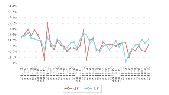 中國海關總署網站發布了2014年前三季度中國進出口的情況,中國9月貿易進出口額310億美元,預期411億美元,前值498.4億美元。中國9月出口同比增速15.3%,同比增速創19個月新高。預期12%,前值9.4%。中國9月進口同比增速7.0%,同比增速創7個月新高。預期-2.0%,前值-2.4%。