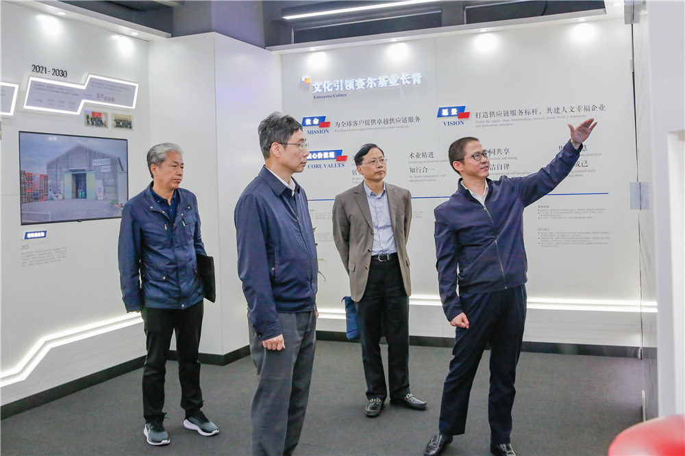 徐總在企業文化展廳做簡要匯報。徐總表示,賽爾集團歷經25年發展,先后經歷了企業初創期、子公司發展階段、集團化運作期,現已進入連續創業階段。集團從深耕日用消費品出口領域向跨境電商出口、外貿服務生態圈、進口消費品業務、國內消費市場、投資賦能外向型企業以及數字生態園區等領域不斷延伸拓展,并取得了良好的發展成效。徐總認為,賽爾集團的可持續發展,得益于正確的戰略決策、良好的激勵機制和內部競合協同文化,這是我們創造你追我趕局面、打開公司活力的一把萬能鑰匙。徐總表示,當前我們重點加大數字化賦能業務應用場景,做好做深產品研發創新,加大新興市場客戶開發,關注業務質量與效率提升,以最大耐心最強努力,靜待市場形勢逐漸好轉。同時,我們高度重視企業文化的核心引領作用,下一步將聚焦員工成長、文化傳播、幸福建設、教育支持、慈善救助和社會價值等六個領域提出可實施的行動計劃,打造高質量發展和共同富裕的賽爾樣本。