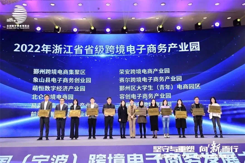 大會進行了5個獎項的頒發儀式。其中,園區獲得了2022年度省級跨境電子商務產業區、第五批市級跨境電子商務產業園區2個獎項,優遠公司獲得了2021年度浙江跨境電商出口知名品牌獎項。