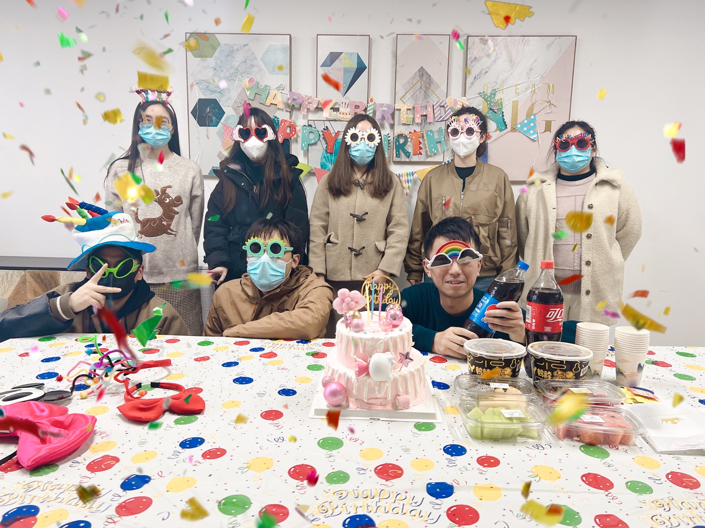 文宣部為大家準(zhǔn)備了精美的生日蛋糕、小吃零食、飲料水果,并貼心地拉起了生日祝福橫幅,11位快樂的壽星聚集在18樓的茶水休息室。點(diǎn)燃三根蠟燭,慶祝大家一起奔三的“美好”時(shí)光,雖然里面混入了幾位疑似大齡的人員,不過問題不大,就讓他們“濫竽充數(shù)”一下吧。粉色的雙層蛋糕上,亮起了燭光,大家一起吹滅蠟燭,許下美好的祝愿。絲滑的奶油、爽脆的水果、香辣的鴨脖、冒氣的可樂,一同組成了這次生日宴會(huì)難忘的回憶。