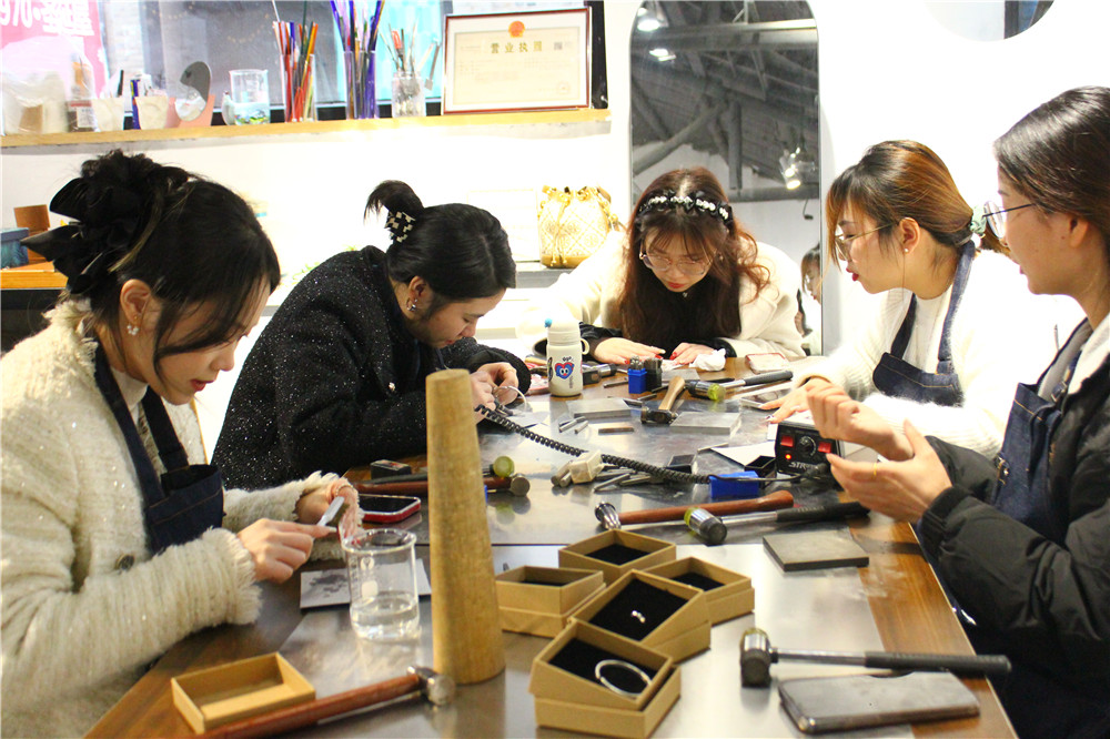 下午大家到沐生銀飾進行銀鐲DIY活動。在老板和店員小姐姐的指導下,我們一步步操作:刻字,紋路雕琢,再到成型和打磨,共用了2個小時??粗y條華麗變身成手鐲,我們的汗水和付出也算是值得了。老板還友情贈送了許愿牌和祈福布條,我們將新年愿望寫下,帶著美好的祈愿將許愿牌掛在了門外的大樹上。