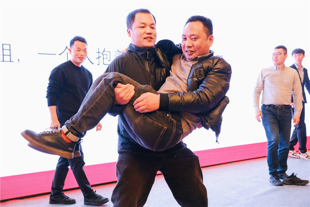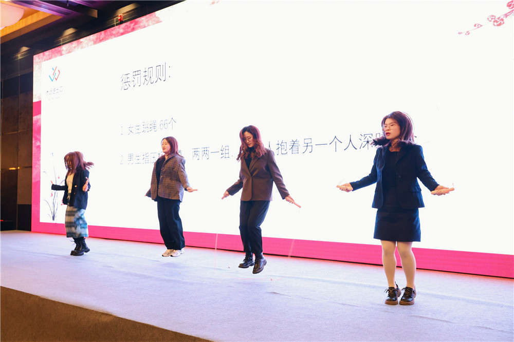 回首2023,各部門也有未完成的業(yè)績(jī)指標(biāo)。而獎(jiǎng)罰分明,方能激發(fā)干勁。會(huì)議上,我們也針對(duì)未完成業(yè)務(wù)指標(biāo)的部門領(lǐng)導(dǎo),設(shè)定了小小的懲罰。我們的懲罰分為女生部分和男生部分。女生的懲罰是跳繩66個(gè);男生的懲罰是兩兩一組,在指壓板上進(jìn)行深蹲,要求一人抱著另一個(gè)人深蹲5個(gè)。懲罰的游戲環(huán)節(jié)讓原本稍有嚴(yán)肅的會(huì)議氣氛瞬間變得輕松而歡快起來(lái)。瞧,那指壓板上顫抖的雙腿和吃力的表情包瞬間吸引了大家的眼球,讓我們猜猜是哪位領(lǐng)導(dǎo)的表情又會(huì)被部門成員做成新的表情包呢?