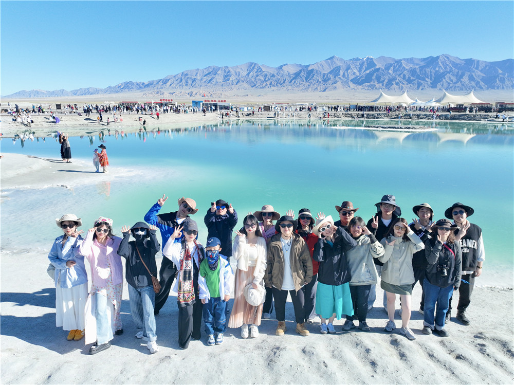 第三站是翡翠湖,為了更好地記錄這個(gè)美好的時(shí)刻,團(tuán)隊(duì)特意安排了航拍,大家聚在一起對(duì)著鏡頭比耶。在清澈瑰麗的翡翠湖邊,充斥著我們的歡聲笑語。在鏡頭中,我們感受到了生活的平靜與放松。隨后,大家兩人組隊(duì),開啟了越野摩托之行。伴隨著清涼的微風(fēng),沿途美麗的風(fēng)景給每一個(gè)人都帶來了更多新鮮有趣的美好回憶。隨后,我們又經(jīng)過了夢(mèng)幻透亮的察爾汗鹽湖。在這里,大家紛紛開啟了合照模式,隨手一拍都是大片。