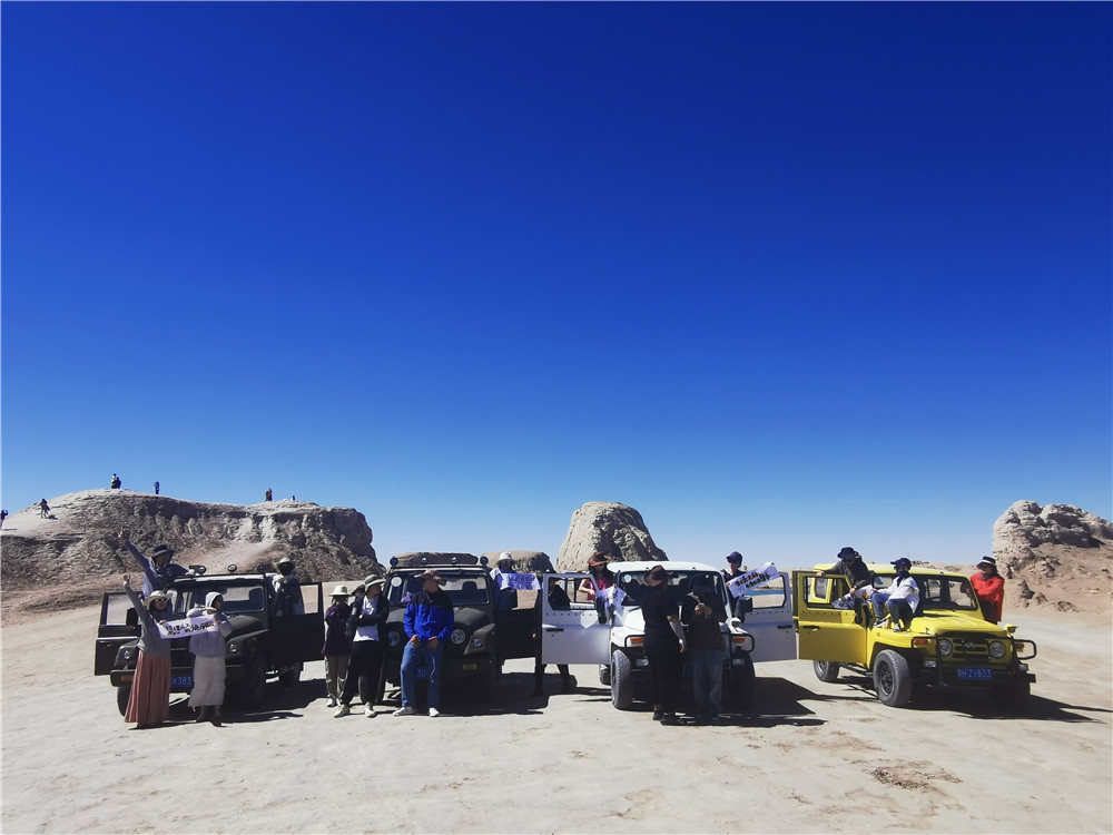 沿著315國道,第二站是獨(dú)一無二的水上雅丹。在這里,大家五人一組,進(jìn)行了一場緊張刺激的越野賽。穿梭在戈壁與湖泊之間,顛簸崎嶇的小路也阻擋不了小伙伴們激動(dòng)的心情。在你追我趕中,不僅看到了雅丹風(fēng)景之美,在聊天打趣中,也讓大家彼此之間有了更深的了解。