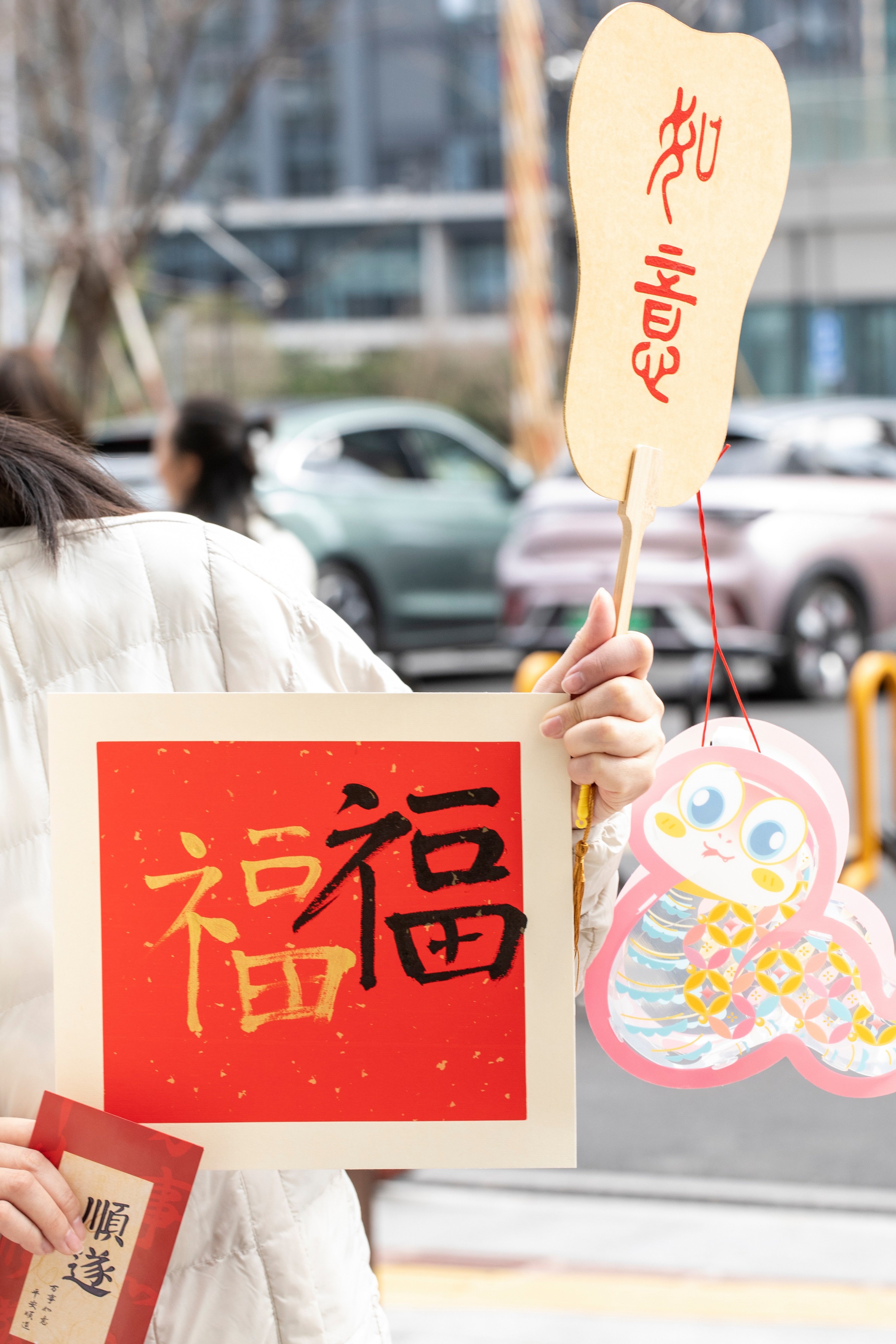 出門來到1F培訓(xùn)室,還可以繼續(xù)體驗(yàn)剪窗花、寫福字、做燈籠。窗花攤位上有各種可愛又難度不一的剪紙,配有剪刀、膠水、刻刀,耐心完成后把窗花粘在背景板上,給今年家里過年增添一件裝飾品;寫福字時(shí),有循規(guī)蹈矩寫“福”的,有發(fā)揮創(chuàng)意,又寫又畫,把蛇形與福字相結(jié)合,也有揮毫潑墨,一展風(fēng)采,引得眾人驚嘆連連;燈籠攤位上可不止能做燈籠,中國結(jié)、福字、柿子、扭扭蛇,甚至是薯?xiàng)l,都能在大家的集思廣益下完成。